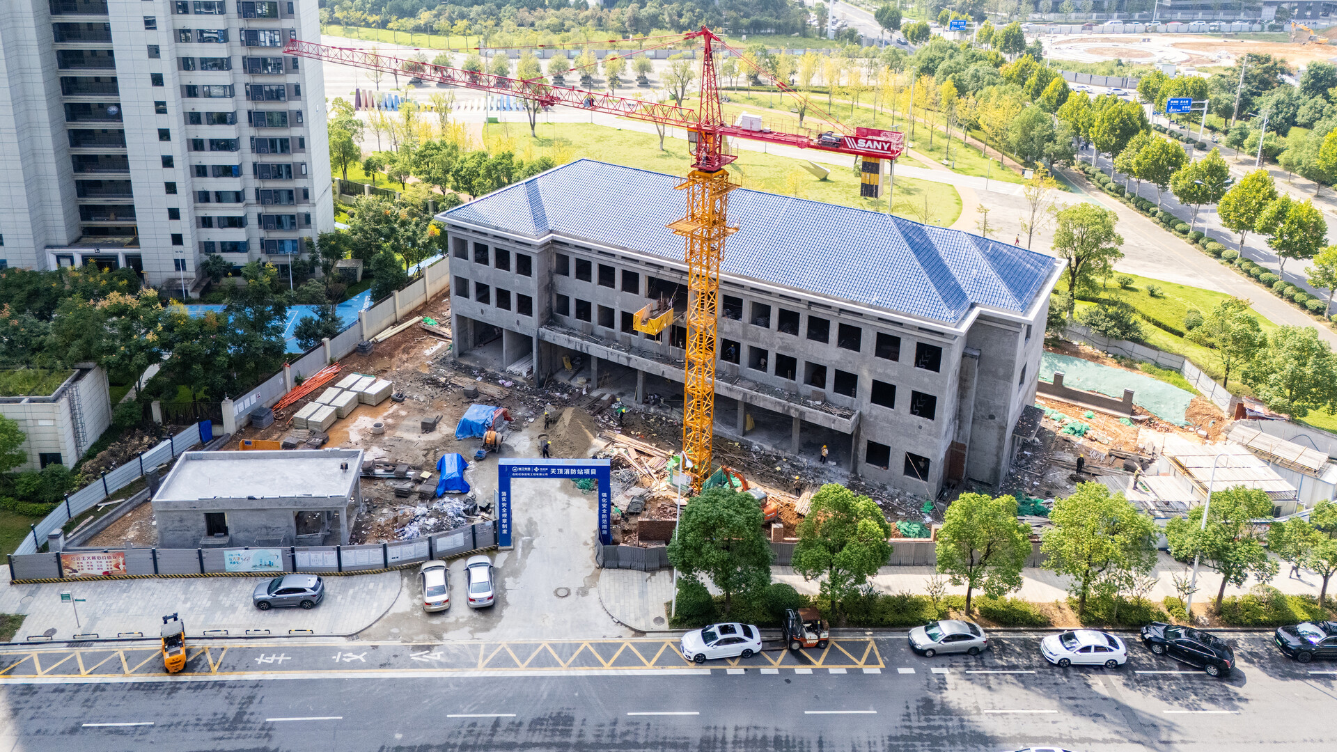 天顶消防站项目目前已顺利完成主体结构封顶。国庆期间,40余名施工人员将紧锣密鼓地开展主体外墙施工、窗户安装及室内地砖铺设等多道工序,全力冲刺10月底竣工的目标,力争如期建成投用,提升区域应急救援保障能力。